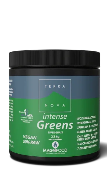 Intense Greens biedt 8 verschillende vers gevriesdroogde groene groenten en botanicals. Deze Super-Shake is een mooie toevoeging op een dag wanneer er minder aandacht wordt besteed aan een gevarieerd dieet, bij ouderen die moeilijk kunnen eten, om het zuur-base evenwicht te behouden, bij lichamelijke inspanning of bij het behouden van een gezonde levensstijl.